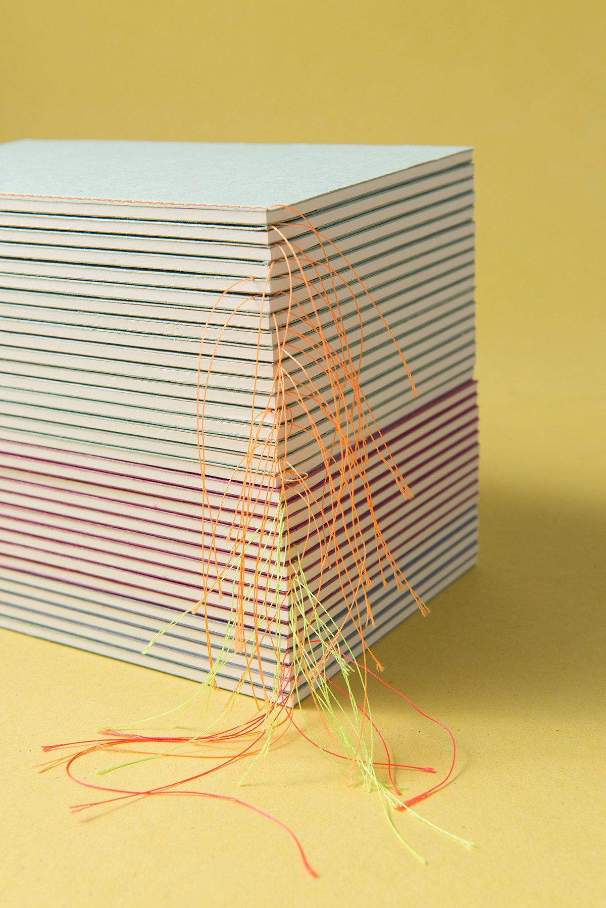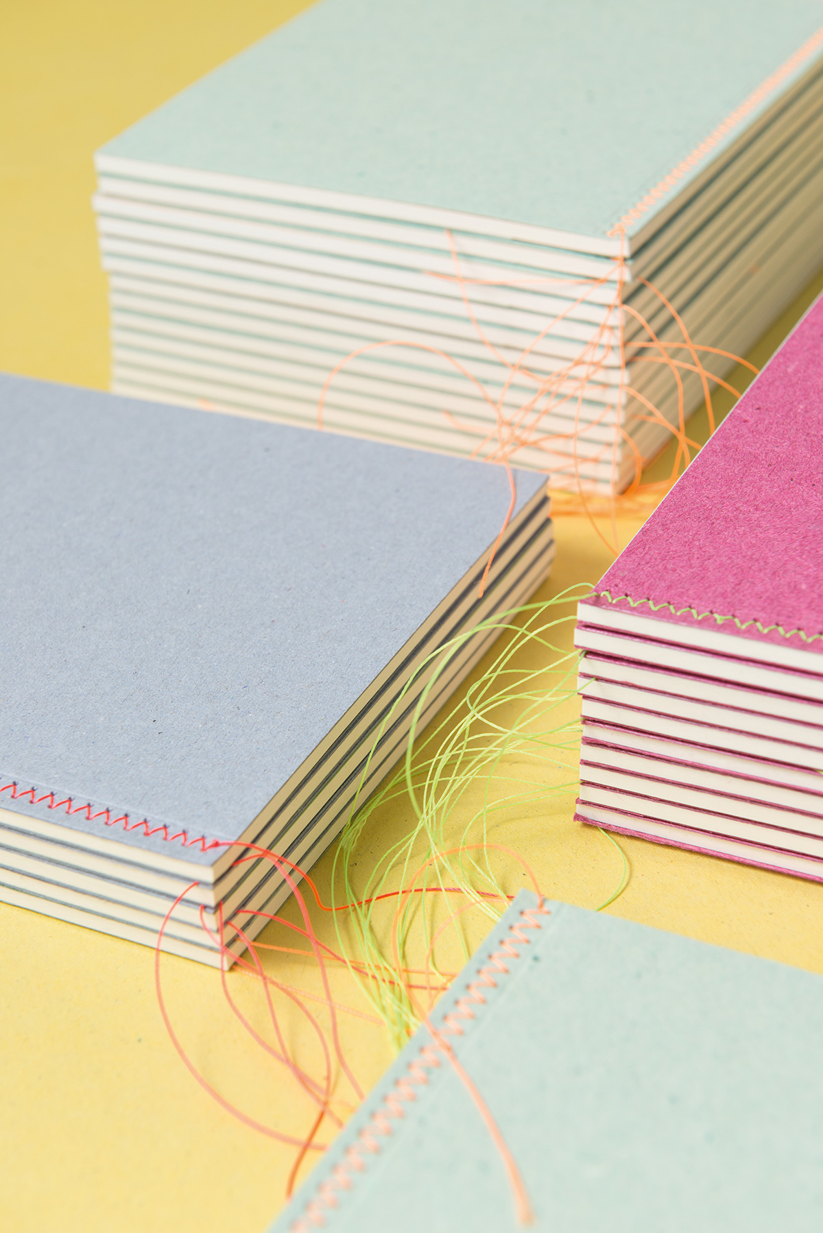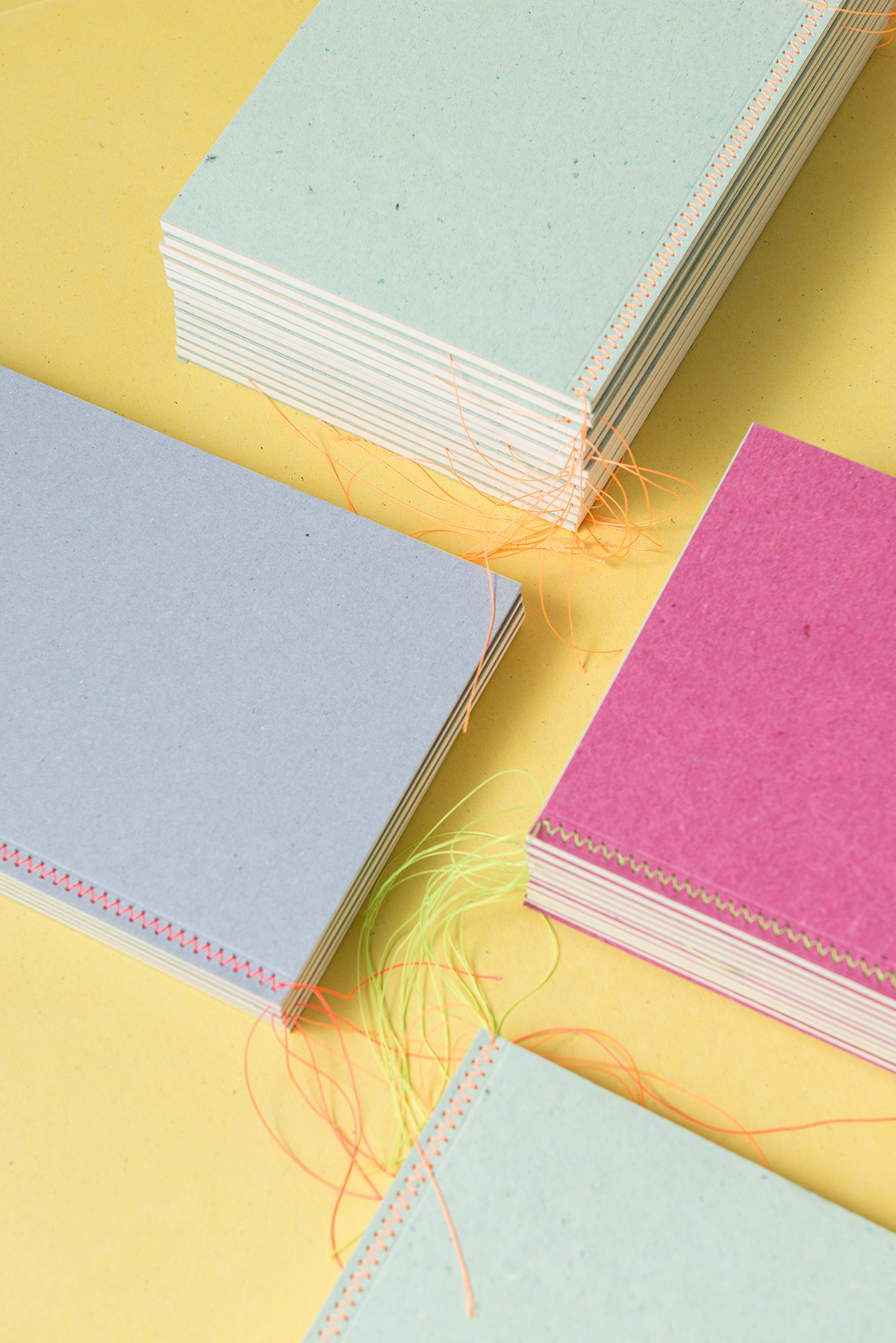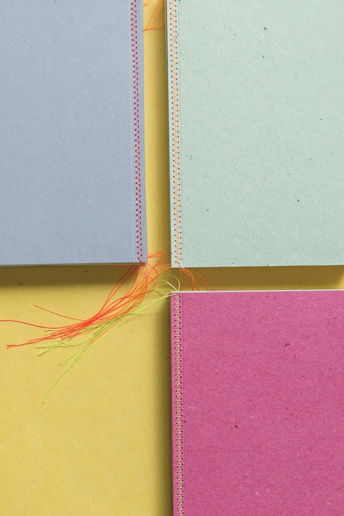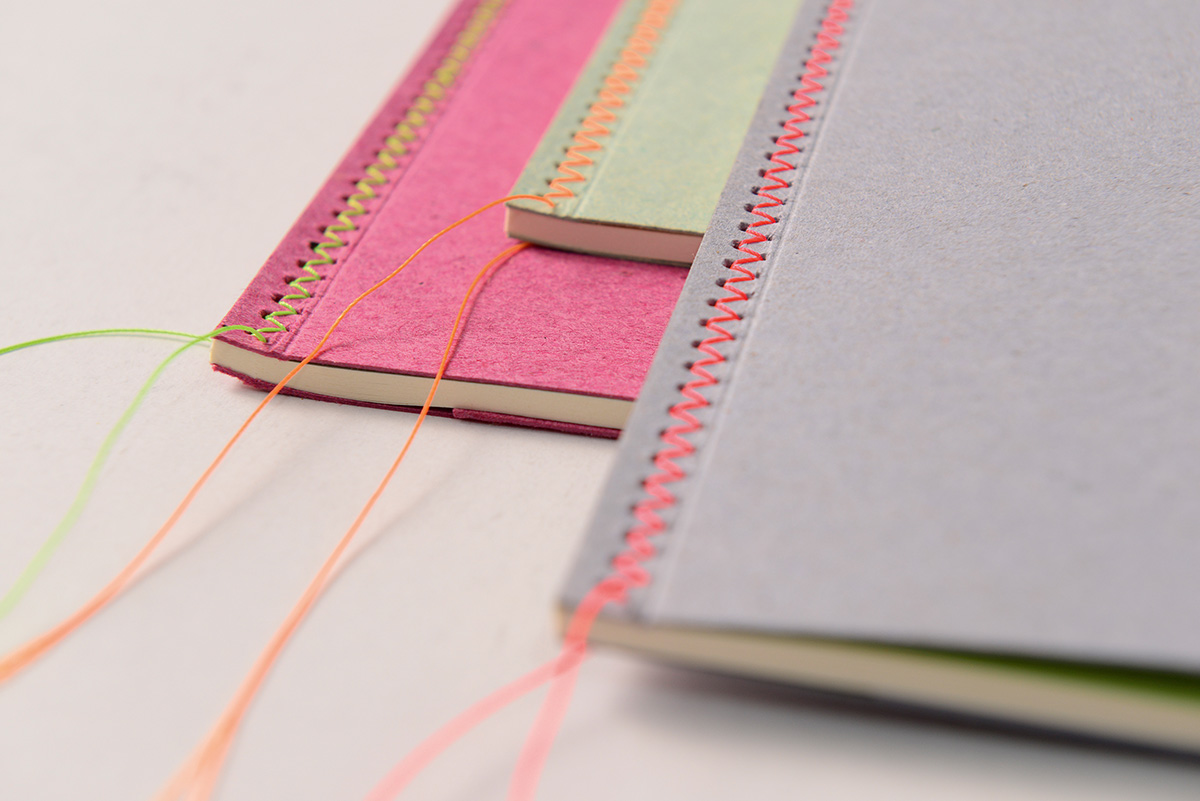 Three Mrs. Stitches notebooks that show their luminous threads on the covers with a sewing technique called Herringbone stitch. Pure beauty on the shelves.